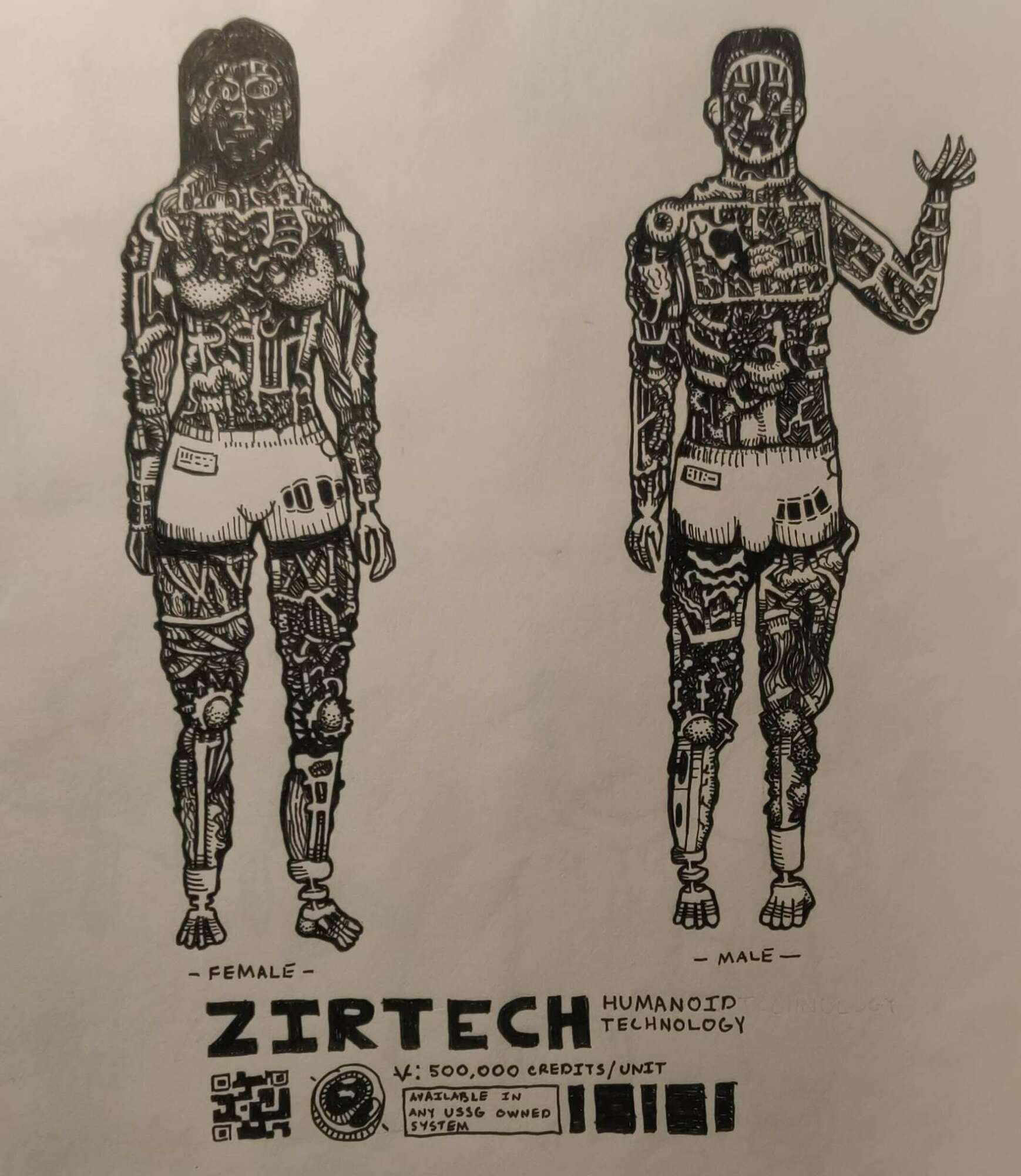 A drawing from my sketchbook. It was fun creating the strange mechanical and fleshy texture that makes the majority of each robot. I found amusing to speculate how business operated in this reality; can you imagine the logistics of interplanetary shipping of a humanoid robot? Talk about a headache.